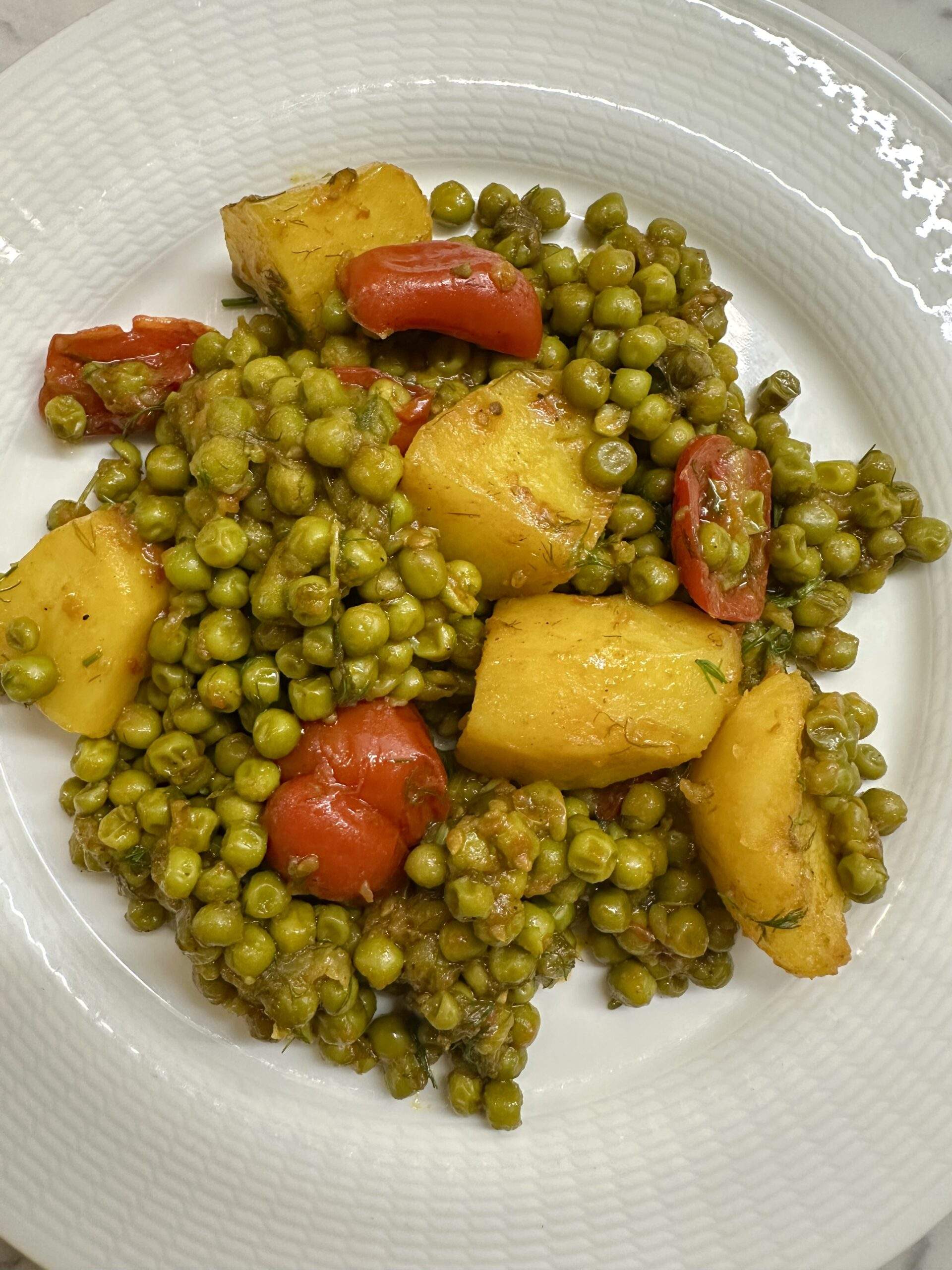 - Σε μία μεγάλη πλατιά κατσαρόλα σοτάρουμε σε ελαιόλαδο πρώτα το κρεμμύδι με τον αρακά και στην συνέχεια προσθέτουμε όλα τα υπόλοιπα υλικά και ανακατεύουμε καλά ,αλατοπιπερώνουμε