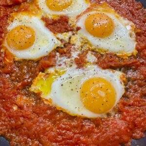 - Κάνουμε στην άκρη του τηγανιού την σάλτσα και προσθέτουμε ακόμη λίγο ελαιόλαδο , σπάμε τα αβγά ένα ένα μέσα όπως στην φυτογραφία , σκεπάζουμε με καπάκι και αφήνουμε για 10-15 λεπτά ανάλογα πόσο μελάτα τα θέλουμε