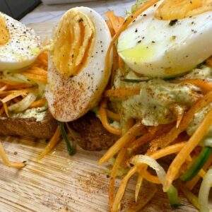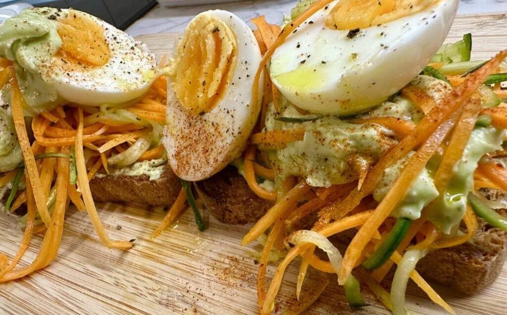 - Φριγανίζουμε το ψωμί και στρώνουμε μισή δόση από την κρέμα , από πάνω το καρότο με το αγγούρι και στην συνέχεια τα αβγά κομμένα στην μέση