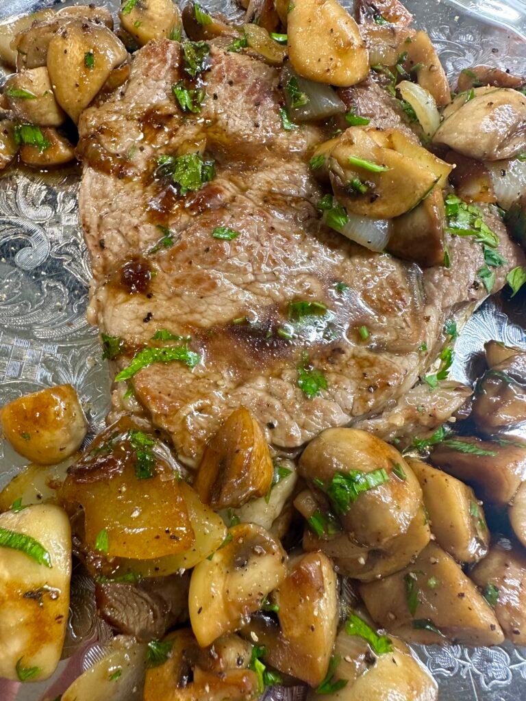 Μπριζόλα μαγειρεμένη στο τηγάνι με σοταρισμένα κρεμμύδια και μανιτάρια , σβησμένη με μαστίχα Χίου