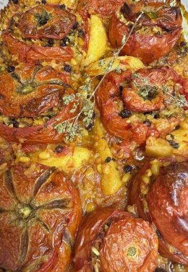 Ντομάτες γεμιστές πολίτικες ! Κουκουνάρι σταφίδες κανέλα και δυόσμος τα υλικά που κυριαρχούν για ένα αποτέλεσμα γλύκα !