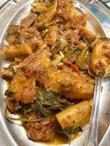 Πατάτες Πρασοσέλινο στην κατσαρόλα κοκκινιστές μαγειρεμένες με φρέσκια ντομάτα και άνηθο .Όσο απλά μαγειρεύετε τόσο νόστιμο είναι !