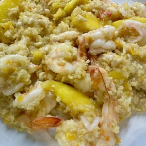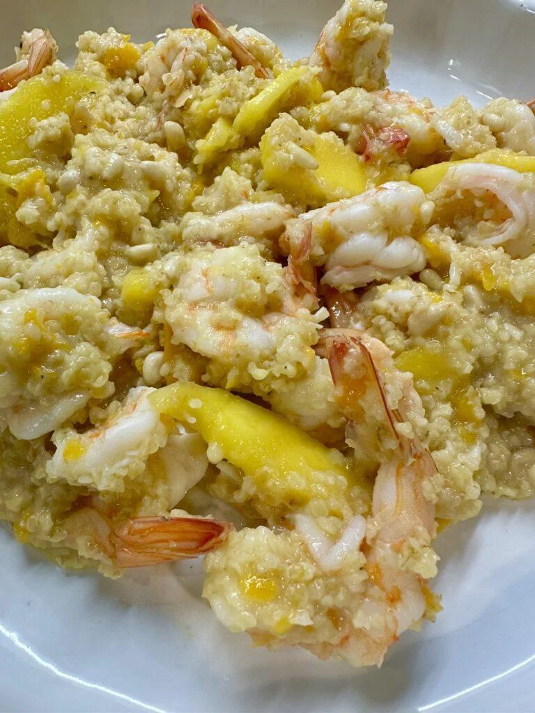 - 3 λεπτά πριν είναι έτοιμο Ρίχνουμε τις γαρίδες , το μάνγκος και το βούτυρο και ανακατεύουμε