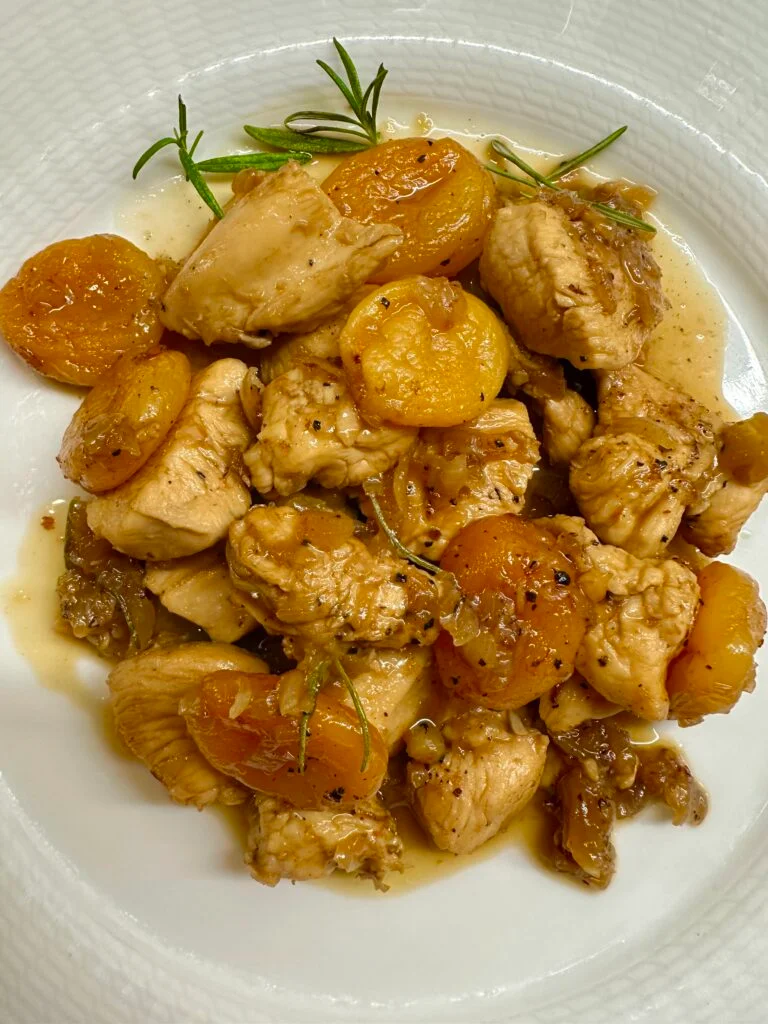 Φιλετάκια κοτόπουλο με αποξηραμένα βερίκοκα και σάλτσα από μαύρο ρούμι