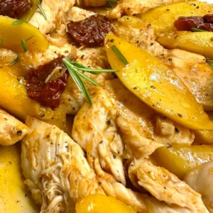 Φιλετάκια κοτόπουλο με μάνγκος και λιαστές ντομάτες σβησμένα με μαστίχα Χίου