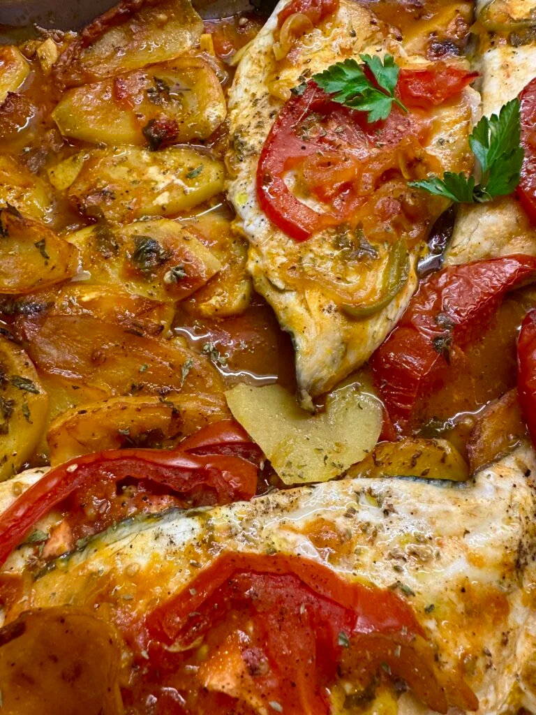 Φιλέτο τσιπούρας πλακί στον φούρνο με πατάτες και κρεμμύδι , σκόρδο μαϊντανό !