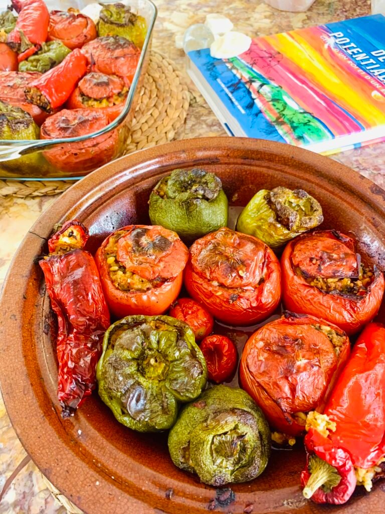 - Αδειάζουμε τις ντομάτες και κρατάμε στην άκρη την ψίχα τους , αδειάζουμε και τις πιπεριές από τα σπόρια τους και στρώνουμε σε ένα μεγάλο πιρέξ αλατοπιπερώνουμε τα λαχανικά