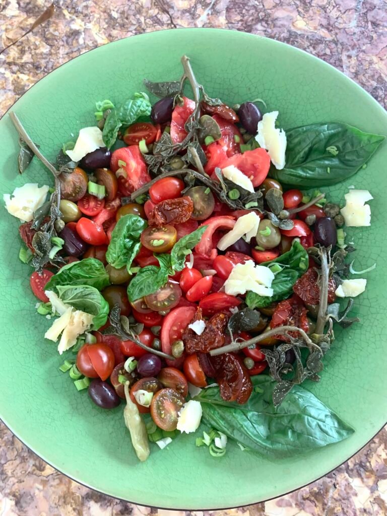 Χορταστική απολαυστική σαλάτα του καλοκαιριού με ποικιλία από ντοματίνια , γραβιέρα και βασιλικό!