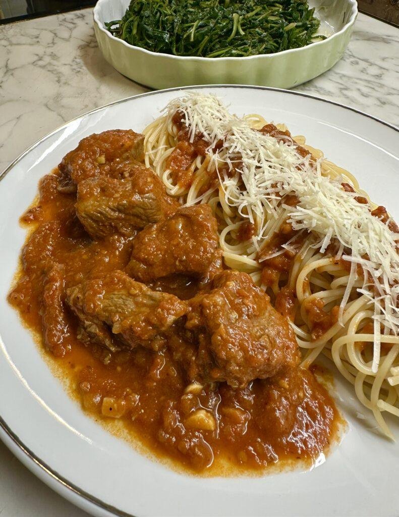 Μοσχαράκι από ελιά κοκκινιστό στην κατσαρόλα με μακαρονάδα