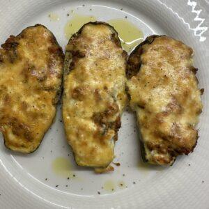- Γεμίζουμε μοιράζοντας τον κιμά μέσα στα κολοκυθάκια και στην συνέχεια μοιράζουμε από πάνω την κρέμα τυριού