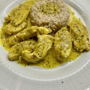 Σιγομαγειρεμένα φιλετάκια κοτόπουλο σκορδάτα με πλούσια σάλτσα μουστάρδας ,άρωμα πορτοκαλιού
