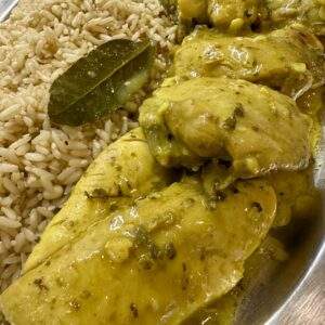 Κοτόπουλο κατσαρόλας σκορδάτο με θρούμπι και πιλάφι με σουσάμι και κουκουνάρι