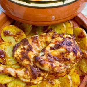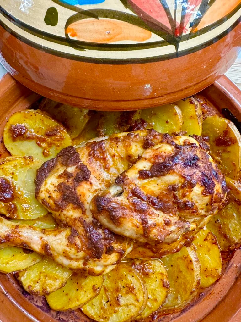 Κοτόπουλο στην γάστρα μαριναρισμένο με αλμυρή μαρμελάδα λιαστής ντομάτας και τραγανές πατάτες