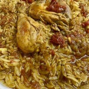 - Σε ένα πιρέξ έβαλα όλη την σάλτσα από το κοτόπουλο και 1 ποτήρι ζεστό νερό , έριξα 250 γρ κριθαράκι χοντρο ,αλατοπιπέρωσα και από πάνω βύθισα το κοτόπουλο , έβαλα σε προθερμασμένο φούρνο στους 190 βαθμούς και έψησα για 20 περίπου λεπτά χωρίς να αφήσω το γιουβέτσι να στεγνώσει αλλά να μείνει ζουμερό