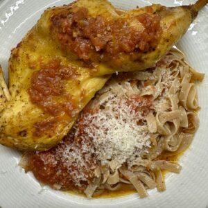 Κοτόπουλο με σάλτσα φρέσκιας ντομάτας και χυλοπίτες μαγειρεμένο στον φούρνο με κρεμμύδι σκόρδο άρωμα μπαχαρικών και τριμμένη κεφαλογραβιέρα
