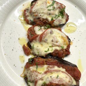 Μελιτζάνες ψητές με πικάντικη σάλτσα και μοτσαρέλα στον φούρνο