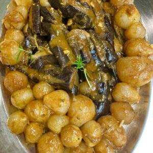 Μελιτζάνες στιφάδο με φρέσκα ολόκληρα κρεμμυδάκια με πλούσια γεύση μπαχαρικών και δεντρολίβανο !