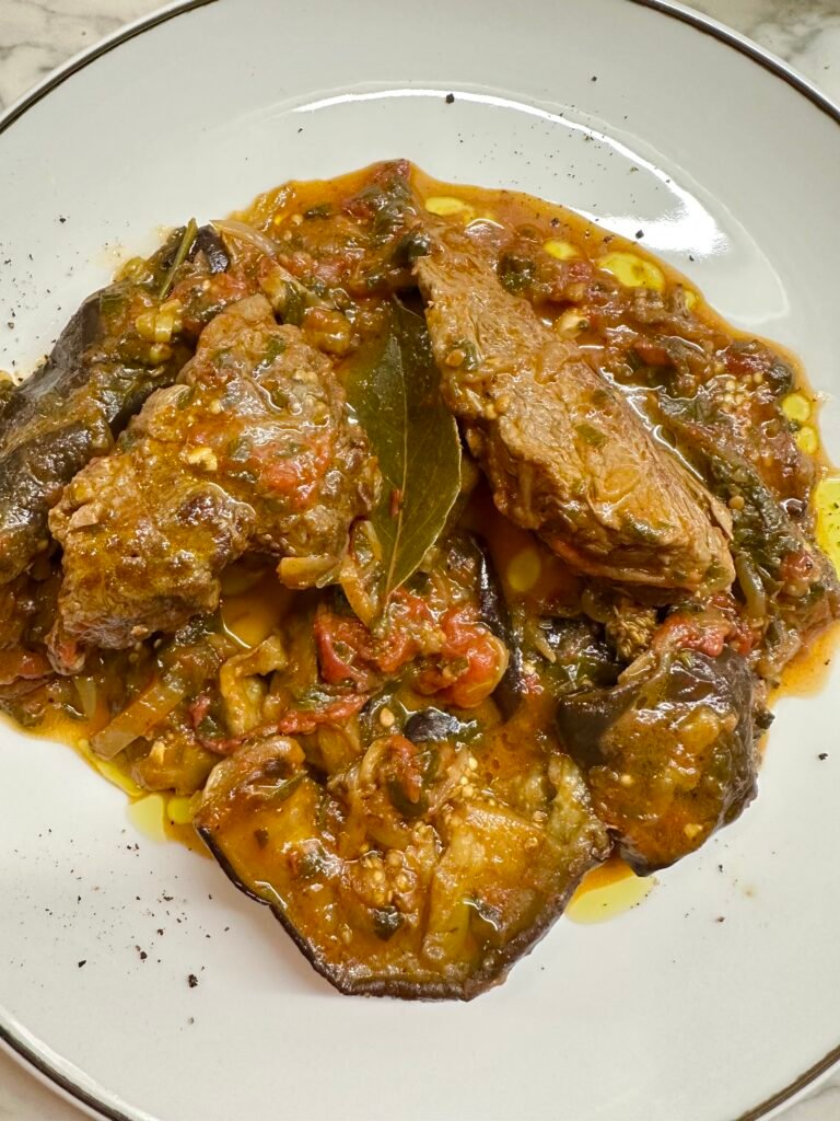 Μοσχαράκι κατσαρόλας με ψητές μελιτζάνες !