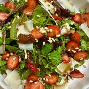 Πράσινη σαλάτα με φράουλες παρμεζάνα και φρέσκο κόλιανδρο