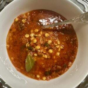 - Σε μία κατσαρόλα σε ελαιόλαδο σοτάρουμε το κρεμμύδι με τα ρεβύθια και τα σκόρδα , προσθέτουμε αρκετό ζεστό νερό και όλα τα υπόλοιπα υλικά , την σάλτσα ντομάτας , αλατοπιπερώνουμε και βράζουμε μέχρι να χυλώσουν όσο θέλουμε