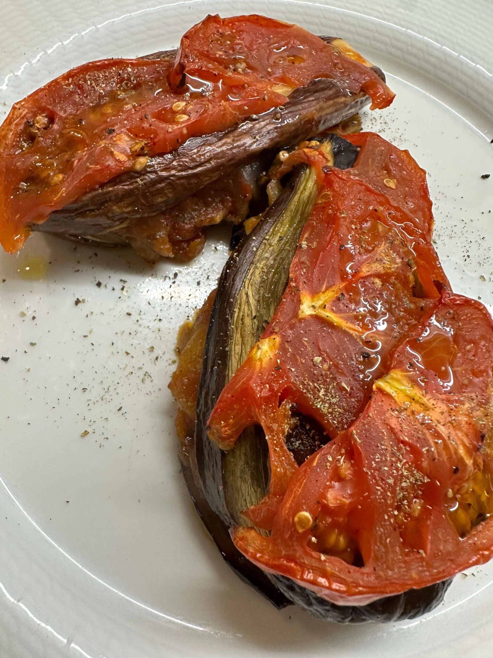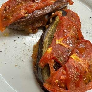- Μοιράζουμε την γέμιση με τα κρεμμύδια πάνω στις μελιτζάνες και κόβουμε την άλλη ντομάτα σε λεπτές φέτες όπου την απλώνουμε από πάνω.