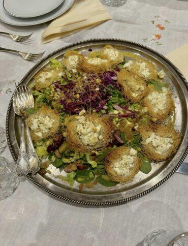 Ανάμιχτη σαλάτα με φύλλα σπανάκι και κόκκινο λάχανο , φωλιές από φύλλο κανταΐφι και φέτα. Συνοδεύετε από κρύα σάλτσα πορτοκαλιού και απαλής μουστάρδας