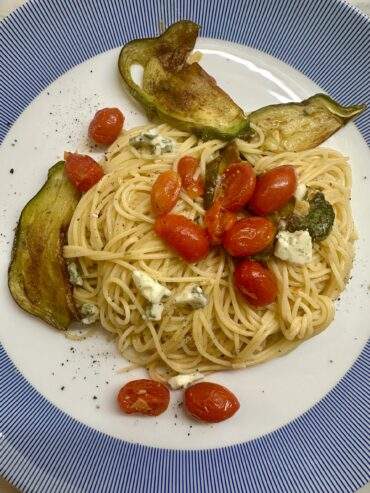 Μία μακαρονάδα απλή αλλά πολύ ιδιαίτερη με λευκή μελιτζάνα , ροκφόρ σκόρδο και ντοματίνια