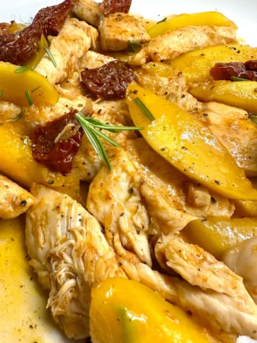 Φιλετάκια κοτόπουλο με μάνγκος και λιαστές ντομάτες σβησμένα με μαστίχα Χίου