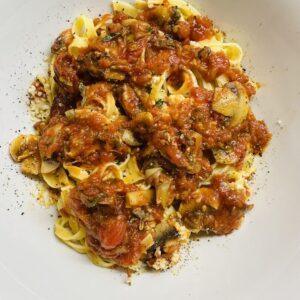 Ταλιατέλες με μανιτάρια και λιαστές ντομάτες , σάλτσα με βασιλικό