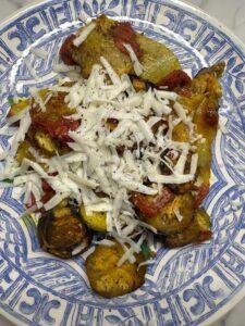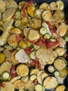 Σε ένα μεγάλο ταψί ρίχνουμε όλα τα υλικά μαζί εκτός από την γραβιέρα και ανακατεύουμε πάρα πολύ καλά , αλατοπιπερώνουμε . Στρώνουμε ομοιόμορφα ώστε να απλωθούν καλά όλα τα υλικά.